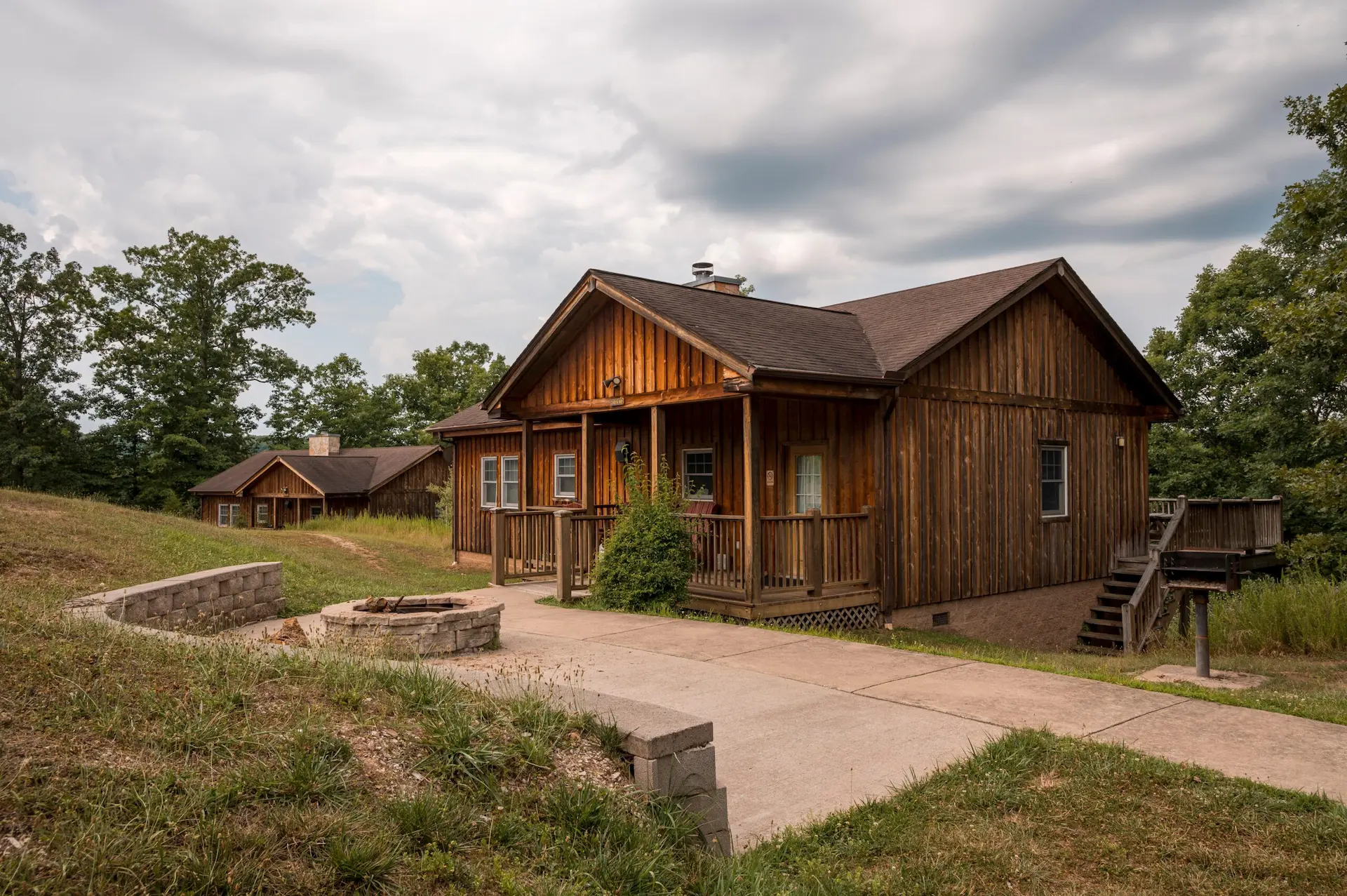 A rustic wooden cabin with a small porch sits on a grassy hill under a cloudy sky, reminiscent of the serene landscapes at Beech Fork State Park. A paved path leads to the front, and a fire pit is visible in the foreground. Another cabin is in the background surrounded by trees.