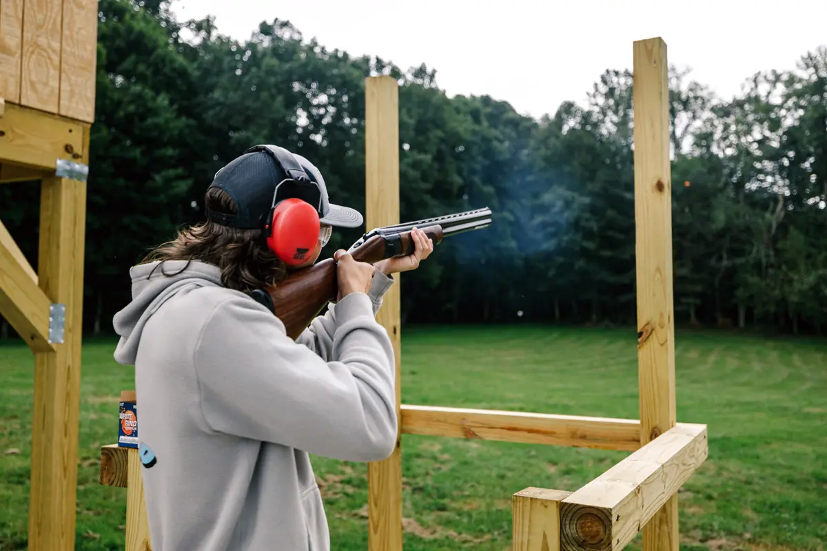 Person aiming shotgun at outdoor clay target shooting range