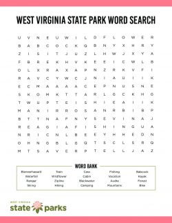 Click to download this West Virginia State Parks word search activity sheet and see if you can find all the parks and outdoor activities.